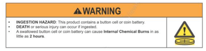 According to the standard, there shall be construction to prevent children from removing the battery. The standard also provides guidelines for the use of warning symbols and statements on products, taking into account the available space. Here is an example of the warning requirements for packaging button cell or coin batteries: